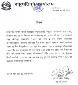 विभिन्न अदालतबाट तोकिएको कैद सजाय भुक्तान गरेका र असल चालचलन भएका खड्ग श्रेङ लिम्बुसहित २ सय ७१ जना र नरबहादुर साँवासहित ५ सय ४७ तथा उमाकान्त पराजुलीसहित १६ जनालाई यही जेठ १५ गतेदेखि मन्त्रिपरिषद्को सिफारिसमा कैद मिनाहा भएको राष्ट्रपति कार्यालयले जनाएको छ ।