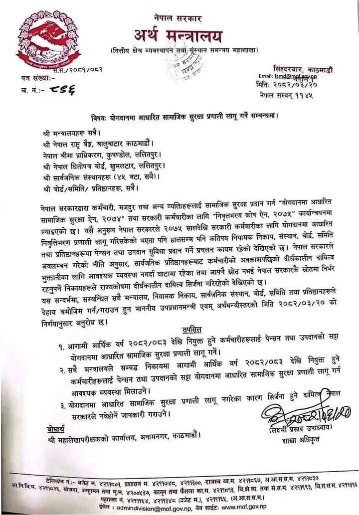 नेपाल सरकारले अब सार्वजनिक निकायहरूमा नियुक्त हुने कर्मचारीलाई पेन्सन तथा उपदान सुविधा नदिई योगदानमा आधारित सामाजिक सुरक्षा प्रणाली अनिवार्य रूपमा लागू गर्ने निर्णय गरेको छ। अर्थ मन्त्रालय स्रोतका अनुसार मिति २०८२ साल असार २० गते माननीय उपप्रधानमन्त्री तथा अर्थमन्त्रीको अध्यक्षतामा बसेको निर्णयअनुसार यो व्यवस्था आगामी आर्थिक वर्ष २०८२÷८३ देखि कार्यान्वयनमा ल्याइनेछ।